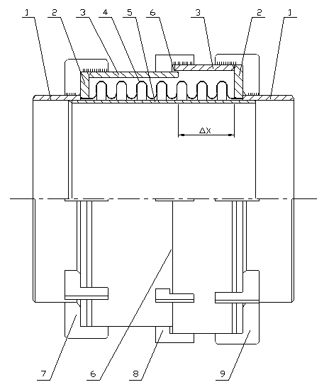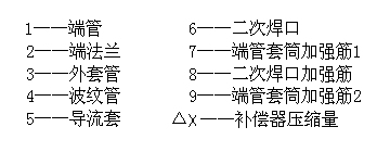 一次性補(bǔ)償器的結(jié)構(gòu)如圖所示,其伸縮元件因只使用一次,且預(yù)熱時介質(zhì)壓力較低,所以波紋管可以有很大的壓縮量,這使得它同普通補(bǔ)償器相比可大大降低造價。一次性補(bǔ)償器外套管在管道運(yùn)行中將會承受介質(zhì)壓力,因此其壁厚不應(yīng)小于同等直徑標(biāo)準(zhǔn)管道壁厚。因整個補(bǔ)償器外殼所承受的應(yīng)力較大,所以加強(qiáng)筋較多。在一次性補(bǔ)償器吸收管道伸長量后將二次焊口密封焊接牢固,由于二次焊口受剪切應(yīng)力,推薦采用兩層三遍焊接,如圖所示。