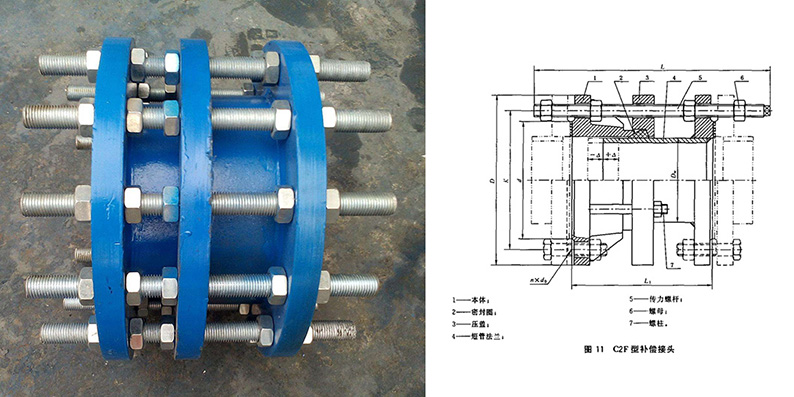 VSSJAF/C2F雙法蘭傳力接頭由法蘭式松套伸縮 接頭和短管法蘭、傳力螺桿、等構件組成。它能傳遞被連接件的壓力推力(盲板力)和補償管路安裝誤差,不能吸收軸向位移,主要用于與泵、閥門等附件的松套連接。優點:安裝簡單方便,方便閥門安裝;特點:雙法蘭連接方式。