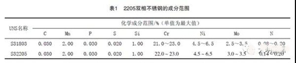 在過去的25年中,最常見的雙相不銹鋼是稱之為2205的合金。文獻(xiàn)資料中幾乎均是利用UNSS31803的成分范圍來描述這種合金的。但是,UNS S31803氮含量最低為0.08%,實(shí)踐證明,要在焊后條件下使熱影響區(qū)和熔化區(qū)保持良好性能,這種水平的氮含量太低。