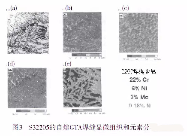 圖3所示為當(dāng)2205合金氮含量高于圖2所示的氮含量,滿足了UNS S31803和S32205的成分極限,其GTA熔化區(qū)的顯微組織和合金元素的分布。由于圖3中焊縫金屬的氮含量較高(氮含量為0.18%,與其相比,圖2的氮含量為0.12%),顯著地改變了焊后組織。