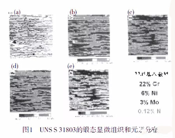 特別是鉻在鐵素體內(nèi)的含量約為25%,在奧氏體內(nèi)僅為20%,見圖1(b),鉬在鐵素體內(nèi)的__含量約為3.5%,在奧氏體內(nèi)鉬含量僅為2.5%,見圖1(d),同時(shí),鎳在奧氏體內(nèi)的含量為7.5%,在鐵素體內(nèi)約為5%,見圖1(c),氮在奧氏體內(nèi)的含量約為0.3%,而在鐵素體內(nèi)為零,見圖1(e)。相的分布基本平衡。由于鋼是熱軋產(chǎn)品,組織呈條帶狀。