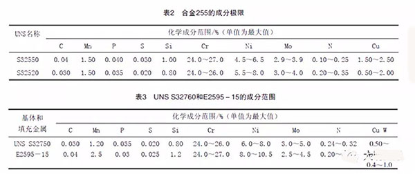 表2比較了UNSS32550與用于堆焊的UNSS32520的成分,其成分大體上相同,但是,UNS S32520的最低氮含量要比UNS S32550高,所以,很清楚,UNS S32520更適用于焊后狀態(tài)的用途。另外,也可使用UNSS32550,但是,要把該鋼種成分的氮含量控制在上限才行。