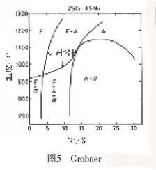 一般的要求是在最低1040℃的溫度進(jìn)行退火,然后從退火溫度進(jìn)行水淬。由于人們不太了解在加熱到退火溫度的過程中,雙相不銹鋼中幾乎總是形成σ相,而鎳含量較高會(huì)使σ相的固溶相線溫度增高。在這種情況下,富鎳的焊縫金屬就危險(xiǎn)。Grobner制做的圖5所示為鎳對(duì)25%Cr-3.5%Mo合金σ相固溶相線溫度的影響。
