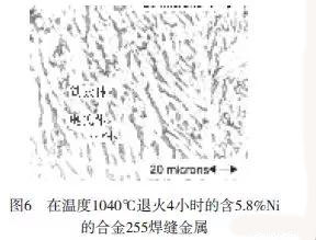 可得出這樣的結(jié)論,在溫度1040℃時(shí),該成分內(nèi)的σ相穩(wěn)定。注意,由于退火時(shí)間長,與后面所示的相比,其顯微組織要粗大得多。圖6所示為與合金255成分(5.8%Ni)完全相匹配的焊縫金屬。焊縫金屬是水淬前在溫度1040℃退火4個(gè)小時(shí),它不含σ相,延展性相當(dāng)好(在4∶1標(biāo)距長度與直徑比的拉伸試驗(yàn)中,伸長率為34%)。