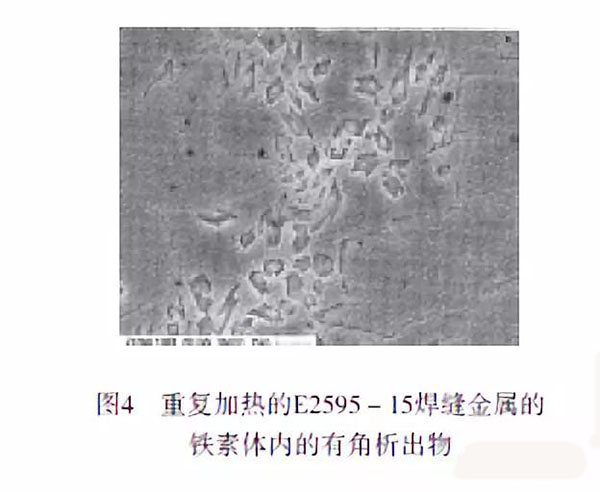 為了找出焊縫金屬?zèng)_擊試驗(yàn)結(jié)果不高的原因,利用掃描電子顯微鏡檢測了工藝評(píng)定測試用的焊縫試樣。圖4所示為試樣中部厚度附近焊縫金屬的顯微組織。僅在鐵素體內(nèi)就有大量的有角析出物。但是沒有準(zhǔn)確確定到底是什么析出物。我們的結(jié)論是析出物是在對(duì)測試試樣進(jìn)行十二道次的焊接時(shí)反復(fù)重復(fù)加熱產(chǎn)生的。
