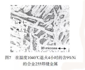 當(dāng)將其他成分相似,但鎳含量達(dá)9%的焊縫金屬255合金在溫度1040℃進(jìn)行退火并進(jìn)行水淬火時(shí),結(jié)果是在整個(gè)顯微組織有大量的σ相,見圖7。在圖7中,σ相呈現(xiàn)灰色,奧氏體呈現(xiàn)白色,鐵素體呈現(xiàn)黑色。焊縫金屬相當(dāng)脆,伸長率僅為7%(與其相比,在焊后狀態(tài)伸長率為26%)。