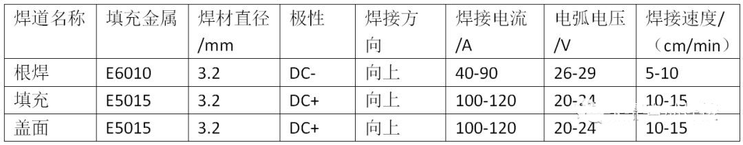 焊條電弧焊時(shí),打底焊采用纖維素型焊條E6010,符合AWSA5.1的規(guī)定,直徑為3.2mm;填充、蓋面焊采用E5015焊條,符合GBT5117-1995的規(guī)定。藥芯焊絲半自動(dòng)焊時(shí),打底焊采用纖維素型焊條E6010,符合AWSA5.1的規(guī)定,直徑為3.2mm;填充、蓋面焊采用藥芯焊絲E71T8-Nil,符合AWSA5.29的規(guī)定,直徑為2.0mm,該焊絲具有操作性能好,焊接質(zhì)量高、抗風(fēng)能力強(qiáng)等優(yōu)點(diǎn)。
