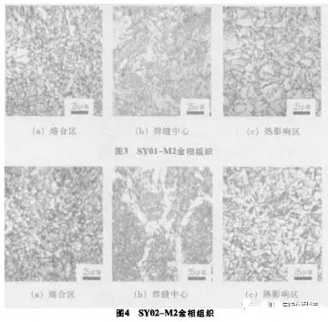 對(duì)于管道環(huán)焊縫接頭的12,3,6點(diǎn)位置的金相試件進(jìn)行了認(rèn)真觀察。采用焊條電弧焊方案得到的3點(diǎn)位焊接接頭金相組織照片如圖3所示;采用藥芯焊絲半自動(dòng)焊得到的3點(diǎn)位置處焊接接頭金相組織照片如圖4所示。