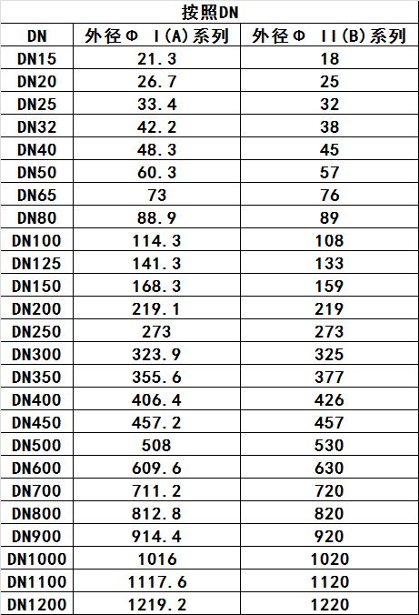 在國內DN的數值基本很常用,但在管路、管道和管閥配件中卻只能代表一部分,為什么說是一部分呢?因為國內的管路系統中同一個DN標注的管道中可以有兩種外徑(Φ即為管路或管道的外徑,后面我們會詳解),如DN100,國內有分I系列和II系列(也有用A系列和B系列來標示)DN100I系列和A系列為Φ114.3,而DN100II系列和B系列則為Φ108。所以在出示計劃書和明細的時候DN多少后面如果沒有注明管道外徑Φ的話,用DN標示的時候需要明確是I系列(A系列)還是II系列(B系列),這樣在采購和詢價過程中就很明確,無需溝通和確認就能知道是要什么樣的管道或配件的外徑。