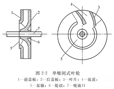 隔熱管托及離心泵的葉輪一般是由兩個(gè)圓形蓋板組成,蓋板之間有若干片彎曲的葉片,葉片之間的槽道為液體的流道,如圖2-2所示。葉輪前蓋板中心位置有一個(gè)圓孔,即葉輪的進(jìn)液口,它裝在泵殼的吸液口內(nèi),與離心泵吸液管相通。
