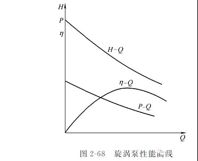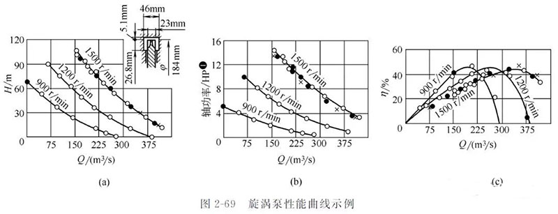 而當(dāng)流量越小,則液體在葉輪內(nèi)的圓周速度和在環(huán)形流道內(nèi)的圓周速度相差越大,離心力相差也越大,隔熱管托縱向旋渦也隨之變大,壓頭也越高。圖2-68和圖2-69為旋渦泵性能曲線及其實(shí)例。由兩圖可見,流量減小時(shí),壓頭就增加。