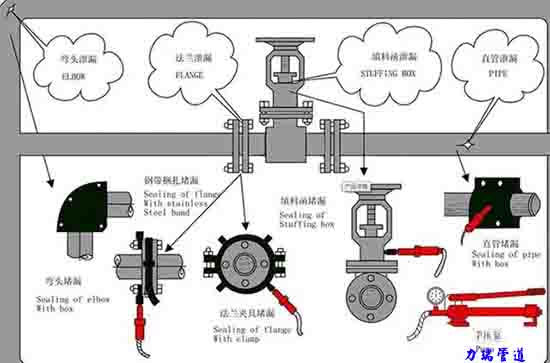 3、凝固法。利用壓入管道中某些物質(zhì)或利用介質(zhì)本身,從泄漏處漏出后,遇到空氣或某些物質(zhì)即能凝固而堵住泄漏的一種方法,稱為凝固法。某些熱介質(zhì)泄漏后析出晶體或成固體能起到堵漏的作用,同屬凝固法的范疇。這種方法適用于低壓介質(zhì)的泄漏。如適當(dāng)制作收集泄漏介質(zhì)的密封腔,效果會(huì)更好。