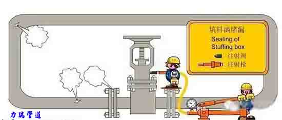 通常是采用相應(yīng)的盒式卡具,把泄露部位完全包封起來(lái),然后往密閉腔注入密封劑消除泄露,注入密封劑方法與法蘭密封法相同,還可按適用溫度、壓力、介質(zhì)設(shè)計(jì)的密封環(huán)槽卡具,在槽中裝上石棉盤根,把此夾具裝在泄露部位上,再向環(huán)槽上的石棉盤根注密封劑及使盤根壓緊夾具的各連接點(diǎn),而消除泄露。