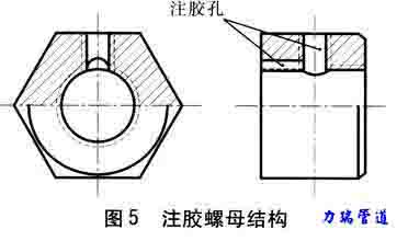 4、螺紋連接部位泄露的密封方法 隔熱管托將卡蘭卡在螺紋泄露部位的外表面,用頂絲頂緊,通過(guò)頂絲內(nèi)孔,用約直徑為3--4mm的長(zhǎng)鉆頭鉆透陰螺紋壁,然后裝上注射槍注入少量密封劑,即能迅速消除泄露。