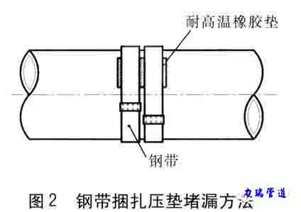 用厚度1--2mm的不銹鋼帶在泄露法蘭付的外圓上扎上一圈,代替法蘭夾具。它僅適用于壓力2MPa以下的泄露點(diǎn),其施工步驟是: