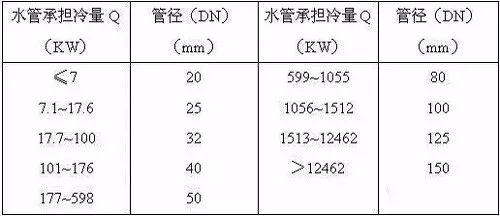 通常可依據與該段連接的空調器的總冷量Q(KW),按下表選定:
